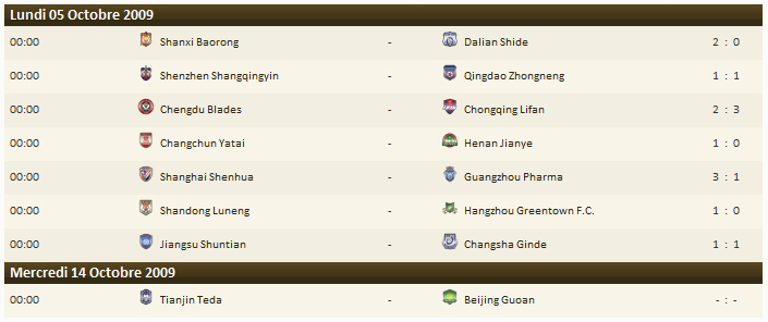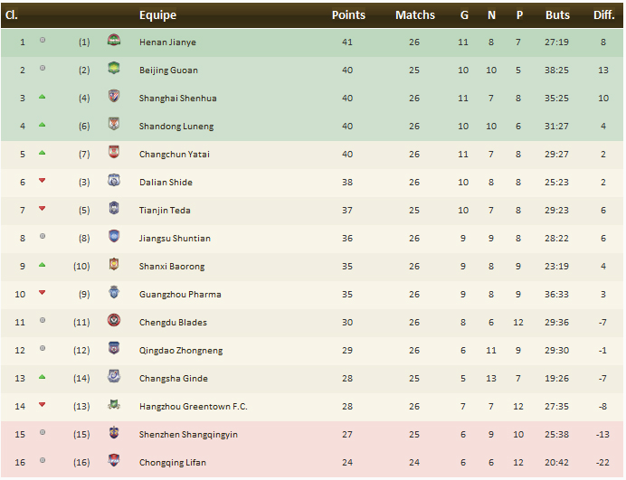 Ce qu’il faut retenir : A quatre journées de la fin du championnat, impossible de dire qui pourra être champion puisque 6 équipes se tiennent en 3 points ou encore, 10 équipes en 6 points. Pourtant, Beijing possède la chance unique de faire un mini-break en cas de succès sur la pelouse des Tianjin Teda le 14 octobre prochain. Pourtant, un succès de ces derniers et ceux-ci se retrouveraient à 1 point du leader, Henan. La situation est tout aussi serrée en bas de classement puisqu’ils sont 5 à se tenir en 5 points. Une seule chose est sure, il n’y a pas de ventre mou cette saison dans le championnat chinois. Probablement LE championnat le plus indécis présent sur Lucarne Opposée.Le classement (cliquez sur l'image pour agrandir) :