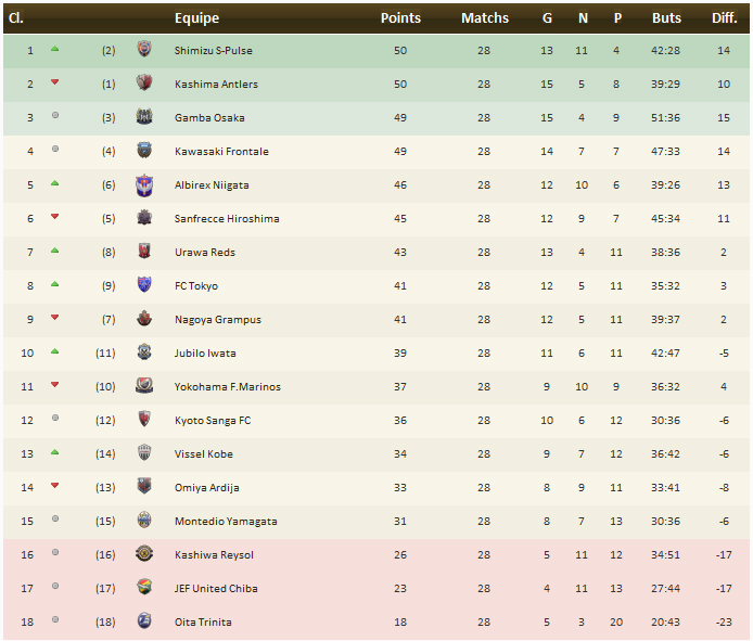 Ce qu'il faut retenir : Avec une série de contre-performances telle que celle de Kashima, il était évident que cela finirait par arriver. 2 défaites dans la semaine, dont une en match en retard contre les Frontale (2-3), et voila que les Antlers ne sont plus leader de la J-league, fauteuil qu’ils occupaient depuis la 8e journée !! Les heureux bénéficiaires sont les Shimizu S-Pulse et leur impressionnante série de 12 matchs sans défaite. Un match nul ce week-end devant Hiroshima permet aux Oranges de prendre la première place. Mais rien n’est joué pour autant. A 6 matchs de la fin, ils sont 5 à se tenir en 4 points. Les Frontale ont ainsi glané 6 points en 4 jours après leur succès devant les Marinos, Gamba s’est largement imposé chez lui devant Omiya et l’Albirex Niigata, en faisant chuter les Antlers chez eux, montrent également l’étendue de leurs ambitions. La lutte sera donc intense en haut de tableau alors que celle pour la relégation pourrait ne plus concerner Oita, qui bien qu’il ne perd quasiment plus, accumule les matchs nuls et doit remonter 13 points pour espérer se sauver (tout en sachant qu’il n’en reste que 18 à prendre). Pour JEF United, l’affaire parait compliquée également : la défaite à Urawa place Chiba à 9 points du premier non relégable Montedio. Reste ainsi les Kashiwa Reysol, battus chez eux par Iwata, les Reysol doivent combler un écart de 5 point pour espérer se sauver.