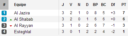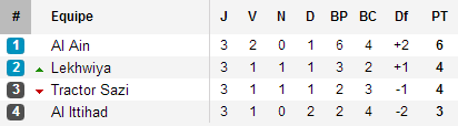 La situation est délicate mais moins désespérée pour Al Ittihad dans le groupe C. Les Tigres, grande figure du football de Moyen Orient, sont actuellement derniers d’un groupe dominé par l’Al Ain de Gyan (meilleur buteur de la compétition) et le Lekhwiya de Gerets. Mais avec seulement trois points de retard sur le leader, les Tigres peuvent encore se replacer. Le choc des deux leaders de la quatrième journée devrait leur permettre de revenir sur eux.
