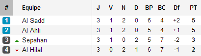 A l’Est, plusieurs habitués de la compétition se retrouvent au pied du mur. Dans le groupe A, Esteghlal, demi-finaliste de la dernière édition, se retrouve dernier, à cinq points de la qualification. Autant dire qu’il faudra un miracle pour que l’équipe de Boubakar Kébé, que les supporters girondins doivent connaître (formé au club) se qualifie. Tout se jouera donc entre les trois autres membres du groupe avec un ballotage favorable pour l’Al Jazira de Felipe Caicedo et l’Al Shabab de Fernando Menegazzo qui pourraient décrocher leur qualification dès la quatrième journée.