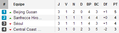 Dans le groupe F, le sprint est également mené par un chinois : Beijing. Encore invaincus, les Guoan résistent à la pression du double champion japonais le SanFre et du dernier finaliste, le FC Séoul. Reste que le groupe est encore dense, Central Coast, le champion australien, ne pointant qu’à deux points du leader.
