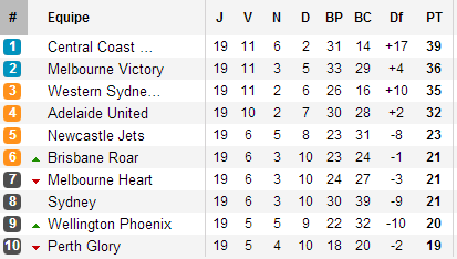 Les hommes de Postecoglou gagne le derby de Melbourne, signent un troisième succès consécutif et se retrouvent désormais à trois points du leader à une semaine de se rendre à Adelaïde pour ce qui sera le choc de la 20e journée. Derrière le quatuor qui luttera pour une place en demi-finale, les six autres clubs de A-league sont encore en course pour une place en play-offs !