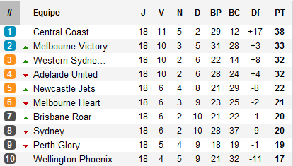 Si Central Coast, Melbourne Victory, Western Sydney et Adelaïde joueront la qualification pour les demi-finales, derrière, la course aux play-offs concerne encore tout le monde. Brisbane profite de la 18e journée pour s’imposer à Perth et recoller à une longueur de Melbourne Heart, à deux de Newcastle qui a sauvé le nul grâce au huitième but d’Emile Heskey. Notons que le point pris par Wellington met fin à une terrible série de quatre défaites consécutives. Malgré cela, la lanterne rouge n’est pas encore hors course, quatre points la séparant d’une place en play-offs.