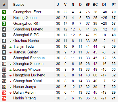 Vous vous en souvenez peut être, à deux journées de la fin Evergrande possédait six points d'avance sur Beijing Guoan, avant de les recevoir sur leur terrain dans un match décisif. Cette confrontation a alors tourné à l'avantage de Guoan. Dans un match très fermé, Evergrande a tout d'abord subit un carton rouge à la 52ème minute. Guoan a tenté d'en profiter et a été récompensé à la 88ème minute lorsque Shao Jiayi -rentré une minute plus tôt- est venu inscrire le seul but du match. Cette victoire 1-0 de Guoan leur a permis de revenir à trois points de Guangzhou, et donc espérer un retour sur le leader lors de la dernière journée. Un fait de règlement important est venu pimenter la fin de championnat : en CSL, lorsque deux équipes sont à égalité de points ce n'est pas la différence de buts qui vient les départager, mais leurs confrontations directes. Et si la différence de buts assurait le titre de Guangzhou, il en est tout autre de ces confrontations, à l'avantage de Guoan (1-1 au match aller et donc 1-0 au match retour).