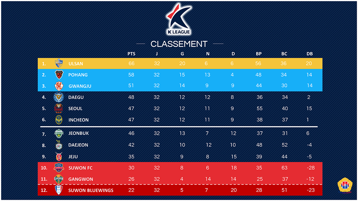 Jeonbuk prend l’eau et ce n’est plus uniquement à cause de la météo. Face à Daegu, concurrent direct pour une place dans le top 6, les Green Warriors ont été cueilli à froid puisque Ko Jae-hyeon ouvrait le score sur le tout premier ballon joué. Habitué à démarrer tambour battant leurs rencontres, les Sky Blues ont doublé la mise très rapidement grâce à Barcelos après une séquence défensive catastrophique de Jeonbuk. Le break en poche, Daegu a reculé, laissant le ballon à Jeonbuk qui ne parvenait pas à en faire grand-chose la majorité du match. Ahn Hyeon-beom, aligné sur une aile dans une défense à cinq, son meilleur poste, a manqué beaucoup trop de justesse face au but avant et après la réduction du score de Boateng. Des erreurs que les Green Warriors ont payé cher puisque dans la foulée d’un loupé de leur ailier, ils ont encaissé un troisième but fatal de la part de Ko Jae-hyeon. Par cette victoire, Daegu se repositionne dans le top 6 alors que Jeonbuk en sort et pourrait bien le manquer. Finale la semaine prochaine face au FC Seoul où la victoire est impérative. Daegu est d’ores et déjà assuré de terminer dans les six premiers.