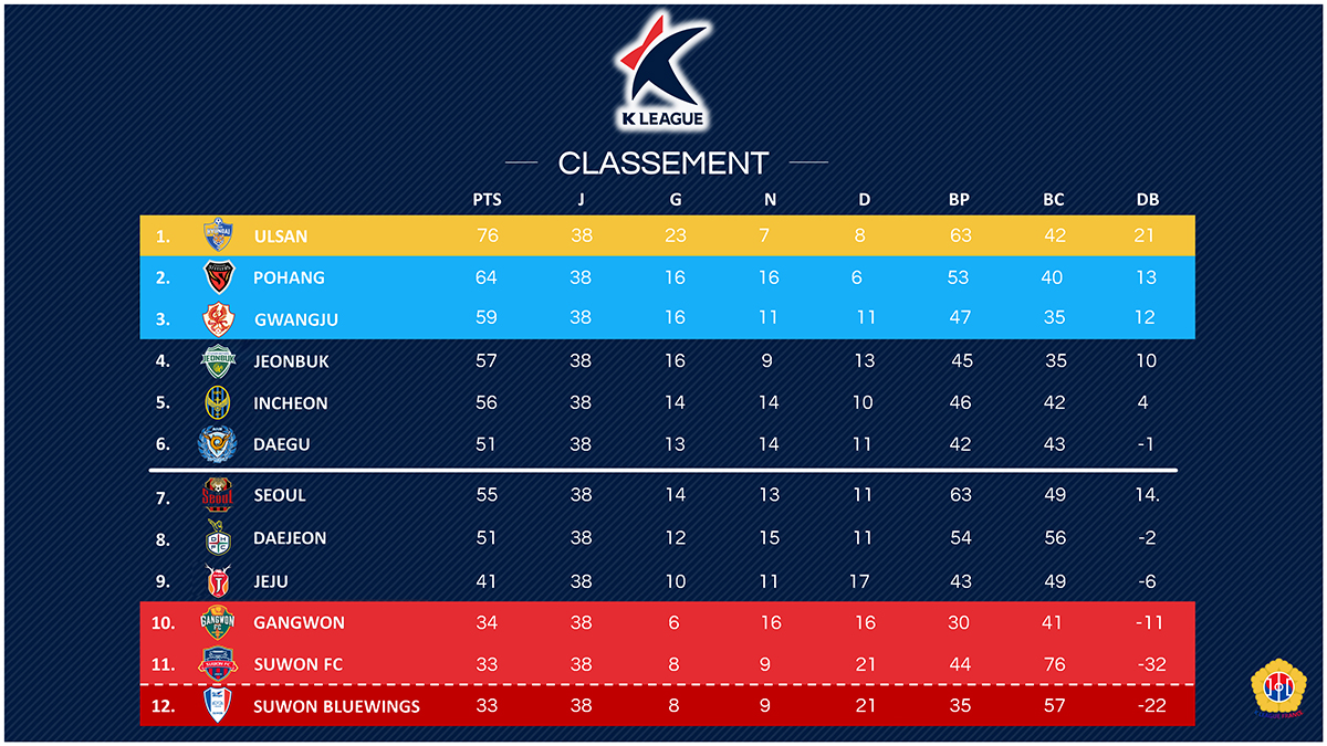 Le couperet est tombé dans la lutte au maintien avec une issue qui était prévisible depuis le début de la saison. Incapables de disposer de Gangwon (0-0) pendant que le Suwon FC faisait match nul face à Jeju (1-1), les Suwon Bluewings sont directement envoyés en K League 2 en terminant dernier du championnat. Une place qu'ils auront occupée une grande partie de l'année. Suwon FC arrache donc son ticket en barrage face à Busan tandis que Gangwon jouera Gimpo. Des barrages dont les matchs aller se jouaient ce jour et qui ont vu les pensionnaires de K League 2 garder l’espoir. Gimpo a tenu Gangwon en échec (0-0) alors que Busan, grâce à un doublé signé Bruno Lamas se rendra à Suwon avec un but d’avance samedi prochain. Dans l'autre match du Final B, Seoul et Daejeon ont fait match nul (2-2).