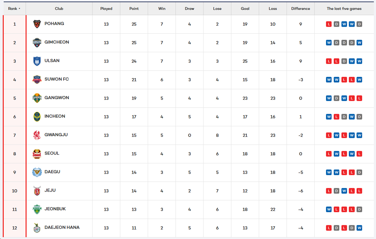 Pour conclure cette treizième journée, Pohang se déplaçait à Suwon avec l'occasion de reprendre ses distances en tête du classement. Mais les Steelers sont tombés sur un os, dans un match assez ouvert avec chacune des équipes ayant l'opportunité de prendre l'avantage. Puis le Suwon FC a fait entrer son homme providentiel. En moins d'une minute, Lee Seung-woo a fait la différence. Il réalisait une superbe passe pour Anderson qui à son tour trouvait Jeong Seung-won pour l'ouverture du score. La connexion Lee Seung-woo – Anderson prend de l'ampleur pour le plus grand bonheur du Suwon FC. La suite de la seconde période était identique à la première avec des opportunités de chaque côté mais avec un manque de justesse dans le tout dernier geste des deux côtés. Pohang met fin à son invincibilité de onze matchs et rate ainsi l'occasion de prendre seul la tête du classement et voit les militaires de Gimcheon revenir à hauteur. Le Suwon FC, au bénéfice de cette victoire, revient sur les talons d'Ulsan à trois petits points.