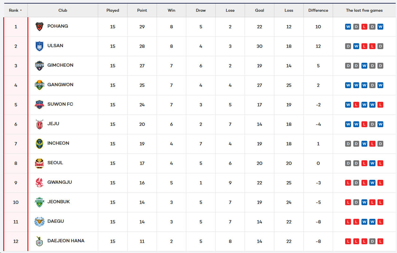 En déplacement sur la pelouse du Suwon FC, Daegu espérait reprendre sa marche en avant après deux défaites consécutives. Mais les locaux ne l'entendaient pas de cette oreille. Même si les meilleures opportunités étaient pour les Sky Blues, qui butaient sur Ahn Jun-soo, Suwon profitait d'une erreur de Choi Young-eun pour prendre les devants. Le portier de Daegu relâchait une frappe anodine sur Kang Sang-yoon qui se précipitait pour marquer. Un coup dur qui fait très mal à Daegu qui perdit le fil du match et Lee Seung-woo doublait la mise à dix minutes du terme. Nouveau succès pour le Suwon FC qui se replace dans la course au podium alors que Daegu retrouve le fond du classement.