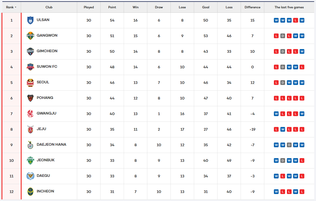Finalement, Gimcheon est la seule équipe du top 6 à suivre le rythme d'Ulsan avec une victoire méritée sur Incheon (2-0). Les militaires sont à quatre points des Tigres et toujours en course pour le titre avec une confrontation qui se profile dans quelques semaines. Pour les Durumi, cette défaite est synonyme de dernière place puisque tous les autres prétendants à la relégation ont gagné.