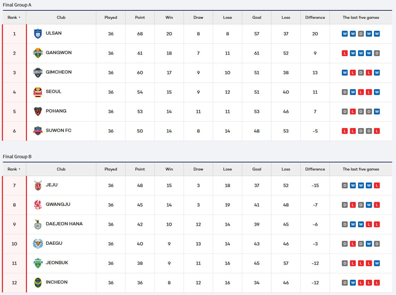 Dans le Final B, la très bonne affaire du week-end est pour Jeju qui a assuré son maintien en allant arracher le match nul sur la pelouse de Daegu (2-2). Privé de Cesinha, les Sky Blues manquent l'occasion de sortir de la zone des barrages. Un résultat qui contente Daejeon, premier non relégable et tenu en échec par Gwangju (0-0) qui conserve donc deux points d'avance sur la zone rouge. Pour les Griffons, le maintien se rapproche avec cinq points d'avance sur Daegu. Enfin, Jeonbuk et Incheon se sont neutralisés (0-0) et conservent les deux dernières places du classement. Avec six points de retard sur la neuvième place, Incheon est presque condamné à disputer au minimum un barrage. Pour Jeonbuk, l'espoir d'éviter une confrontation avec une équipe de K League 2 est toujours présent mais au regard du visage affiché, l'optimisme n'est pas de mise à Jeonju.
