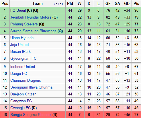 Sur le terrain, le duel Seoul – Jeonbuk aura longtemps tenu en haleine avant de voir l’incroyable duo Damjanović – Molina (49 buts à eux deux) faire basculer le championnat assez rapidement en faveur de Seoul (les hommes de Choi Yong-Soo terminant avec 17 points d’avance sur les verts) alors qu’à l’exception de Seongnam, les grands favoris ont tenu leur rang.