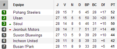 Annoncé tendu, le tour final promet un sprint exceptionnel. Tombé à Séoul lors de la deuxième journée, les Steelers n’ont désormais plus qu’un point d’avance sur Ulsan (et un match de plus), deux sur Séoul, trois sur Jeonbuk. Le titre devrait se jouer entre ces quatre équipes même si Suwon, qui dispose également d’un match supplémentaire à disputer, n’a pas encore dit son dernier mot.