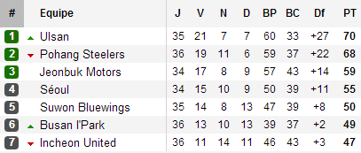 Dans l’autre groupe, celui de la relégation, tout est relancé. En s’imposant à Gyeongnam, Gangwon recolle en effet à sa victime du week-end et peut donc encore espérer le maintien. La défaite du premier non relégable est d’autant plus intéressante pour le suspense car dans le même temps, Daegu et Daejeon se sont imposés. Il n’y a donc que quatre points séparant ces quatre équipes. Une seule sera certaine d’être sauvée.