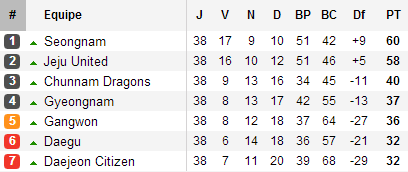 Tout en bas, le couperet est également tombé. Gyeongnam se sauve, laissant Gangwon disputer le match de barrage contre Sangju alors que Daegu et Daejeon sont relégués.