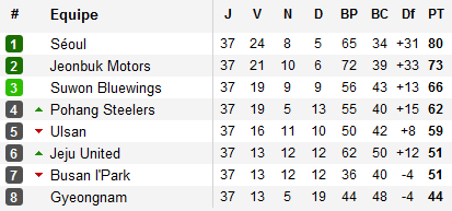 Derrière, la lutte pour la dernière place en Ligue des Champions est relancée. Bloqué par Ulsan, Suwon voit revenir sur lui Pohang qui atomise Gyeongnam en roue libre et jouera gros le week-end prochain à Seoul.