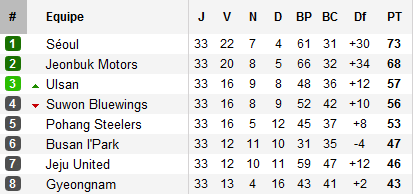 La lutte pour la relégation devrait donc concerner essentiellement Gwangju et Gangwon. Opposés ce week-end, les deux derniers du classement se rapprochent l’un de l’autre suite à la victoire de Gangwon. Un point sépare les deux équipes, une seule sera reléguée.