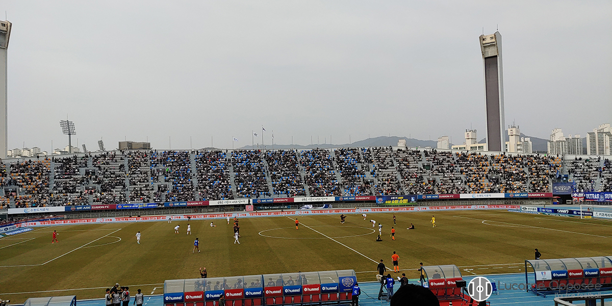 Il est enfin temps d'aller s'installer à notre place pour assister à l'échauffement des joueurs et l'arrivée progressive des supporters. Sans surprise, la petite tribune du kop du Suwon FC est limitée et rapidement pleine alors que les supporters des Bluewings garnissent l'intégralité de la partie droite du stade. Ce n'est pas un hasard s'il s'agit d'un des plus grand fan club de supporters du pays. Les drapeaux se mettent en place, les chants commencent à résonner. Le match est sur le point de débuter. En face de nous, dans la tribune latérale, le « speaker » tente de mettre de l'ambiance en hurlant dans son micro accompagné de quatre cheerleaders. Pour faire patienter les supporters, une dance cam est lancée avec des cadeaux à remporter si la chorégraphie est bien exécutée. Il s'avère que les tentatives d'ambiance sont vite écrasées par les chants des supporters des Bluewings qui dominent largement cette confrontation. À l'entrée des joueurs sur la pelouse, une banderole célébrant les vingt-ans du club se déploie dans la tribune sous les cris de « La victoire pour Suwon Samsung ».