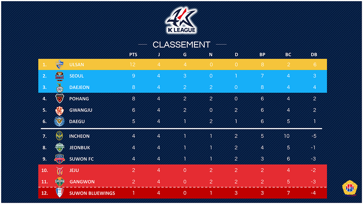 Le début de Jeonbuk est catastrophique. Très actifs sur le marché des transferts avec un recrutement XXL, les Green Warriors n'ont pas évolué dans leur jeu et ne parviennent pas à faire décoller leur saison. Un visage identique aux années précédentes. Dernier échec en date sur la pelouse de Daegu où le manque d'idée offensive aura eu raison de Jeonbuk (2-0). Il serait sans doute temps d'envisager un changement d'entraîneur. Surtout que devant, Ulsan ne s'arrête pas et a même livré sa meilleure prestation de la saison face à une équipe de Suwon FC dépassée (3-0). De son côté, le FC Seoul s'en sort à la dernière minute face à Jeju (2-1) et se relance même si Choi Chul-won a encore fait une erreur qui a permis à Jeju d'égaliser en fin de rencontre. Derrière le duo de tête, Daejeon pointe le bout de son nez après avoir corrigé les erreurs défensives des Bluewings (3-1) tandis que Pohang enchaîne son deuxième match nul consécutif face à Gangwon (1-1). À noter le gros carton de Gwangju sur Incheon (5-0).