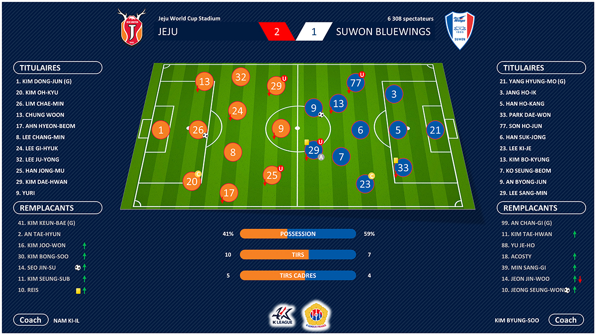 Un nouveau gros morceau pour les Bluewings qui se déplaçaient sur la pelouse d’une équipe de Jeju intouchable en ce moment. Pour cette rencontre, les Insulaires ne pouvaient finalement pas compter sur Koo Ja-cheol, en proie à des pépins physiques et mis au repos. Le vétéran et capitaine de l’équipe était remplacé par Lee Gi-hyuk pour épauler Lee Chang-min. Revenu de suspension, Lee Ju-yong retrouvait sa place sur son flanc gauche alors que Yuri prenait place à la pointe de l’attaque. En face, Kim Byong-soo effectuait encore quelques changements. D’abord dans sa formation avec une nouvelle tactique en 3-3-2-2. Assez surprenant sur le papier. Au niveau des joueurs, toujours pas de Mulic ni de Bulthuis mais le retour d’Acosty sur le banc. À noter la titularisation de Lee Sang-min aux côtés de An Byong-jun ainsi que le retour de Kim Bo-kyung dans le onze de départ.