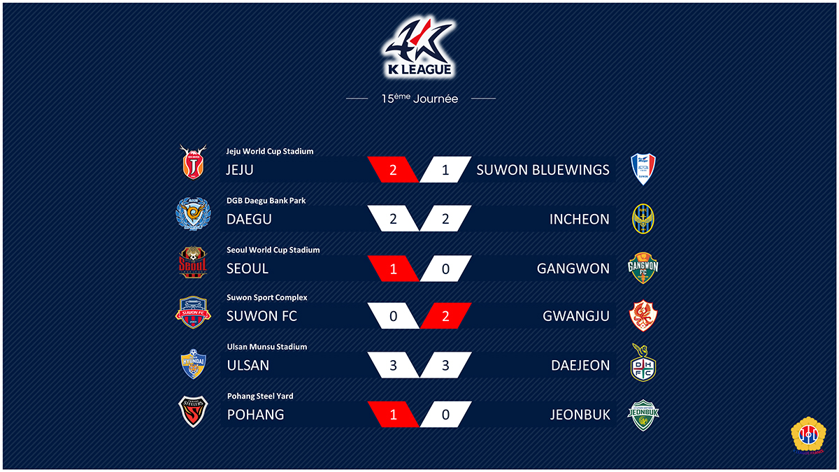 Une victoire importante pour Pohang qui reste au contact de Jeju et Seoul au classement alors que Jeonbuk manque l’opportunité de recoller à Daegu pour une place dans le top 6.