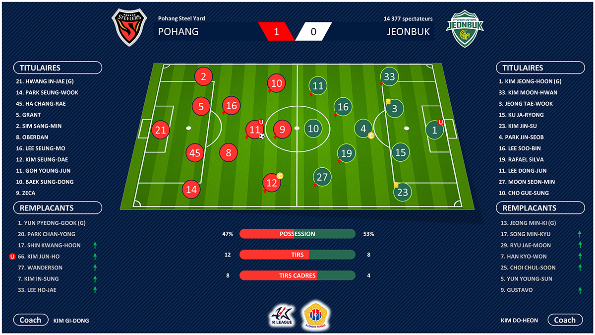 Un autre choc pour conclure cette quinzième journée. Certes sur le papier les Steelers sont mieux lotis que les Green Warriors mais un affrontement entre Pohang et Jeonbuk reste une grande affiche de K League. Pour aborder cette rencontre, Kim Gi-dong ajustait son onze de départ par rapport au match face à Gangwon. Kim Seung-dae prenait la place de Kim In-sung sur le flanc droit de l’attaque associé à Park Seung-wook dans ce couloir. En défense centrale, Ha Chang-rae signait lui aussi son retour aux côtés de Grant. En face, Jeonbuk était contraint de modifier son milieu de terrain à la suite de la blessure de Paik Seung-ho. C’est Rafael Silva qui accompagnait Lee Soo-bin dans l’entre jeu.