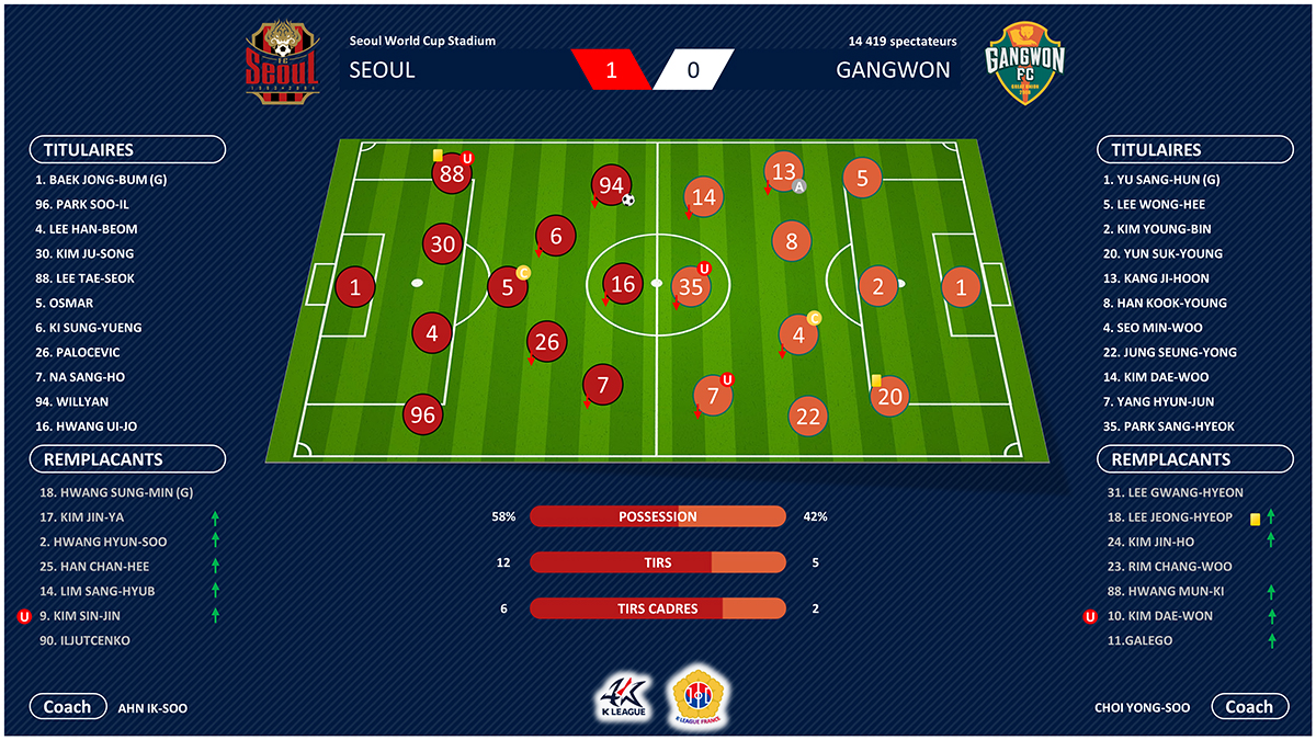 Revanchard du match aller, Seoul avait bien l’intention de s’imposer sur une équipe de Gangwon à la dérive. S’étant vu refuser un but valable lors de la dernière rencontre, Palocevic effectuait son retour dans le onze de départ alors que Willyan occupait le flanc gauche de l’attaque à la place de Lim Sang-hyub. Pour Gangwon, touché après le match de FA Cup, Galego était tout de même sur le banc avec Lee Jeong-hyeop toujours en phase de récupération. Deux petits changements dans le onze de départ par rapport au match précédent, la titularisation de Lee Wong-hee en défense à la place de Kim Woo-seok et celle de Kang Ji-hoon à la place de Yu In-soo.