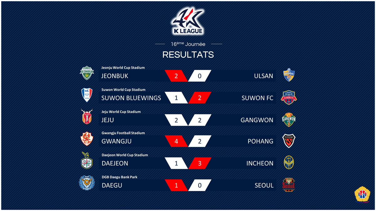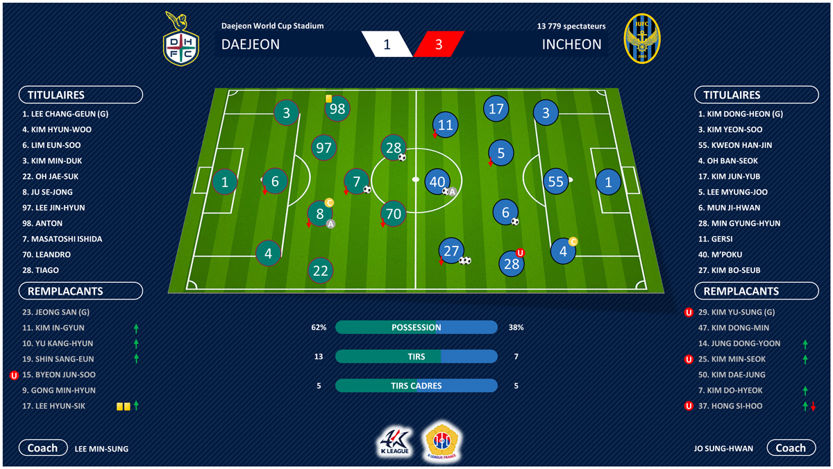 C'est une rencontre assez ennuyeuse qui avait lieu au Daejeon World Cup Stadium. Daejeon démarrait toutefois bien la rencontre et manquait de prendre l'avantage dès la deuxième minute par Ishida Masatsohi. Mais le Japonais voyait Kim Dong-heon sortir très rapidement dans ses pieds pour détourner le ballon. Puis derrière, plus rien jusqu'au pénalty en faveur des Durumi que transformait M'Poku (42' 0-1). La seconde période était du même acabit avec cette fois, des buts sur les seules actions dangereuses des deux équipes. D'entrée, M'Poku servait Kim Bo-seub qui partait tromper Lee Chang-geun et réaliser le break (49e, 0-2). Quelques minutes plus tard, Daejeon réduisait l'écart par Tiago qui reprenait un coup franc de Ju S-jong (60e, 1-2). Mais toujours trop léger défensivement, Daejeon offrait une balle de but à Hong Si-hoo qui voyait Lee Chang-geun sortir sa tentative. Une première alerte puisque Kim Bo-seub signait un doublé sur une frappe en pivot, sans être vraiment bien gêné (78e, 1-3). Daejeon offrait un dernier frisson à ses supporters par Yu kang-hyun mais Kim Dong-heon restait vigilant. Une nouvelle défaite pour Daejeon, la troisième en cinq matchs, qui décroche complètement et perd Lee Hyun-sik, expulsé en fin de match. Certes le podium n'est qu'à cinq points, mais la zone rouge n'est plus qu'à quatre unités. Pour Incheon, cette victoire arrive à point nommé et permet aux Durumi de rester accrochés au bon wagon. À souligner la perte pour Incheon de Hong Si-hoo qui s’est tenu le tendon d’Achille à la suite de son action face à Lee Chang-geun.