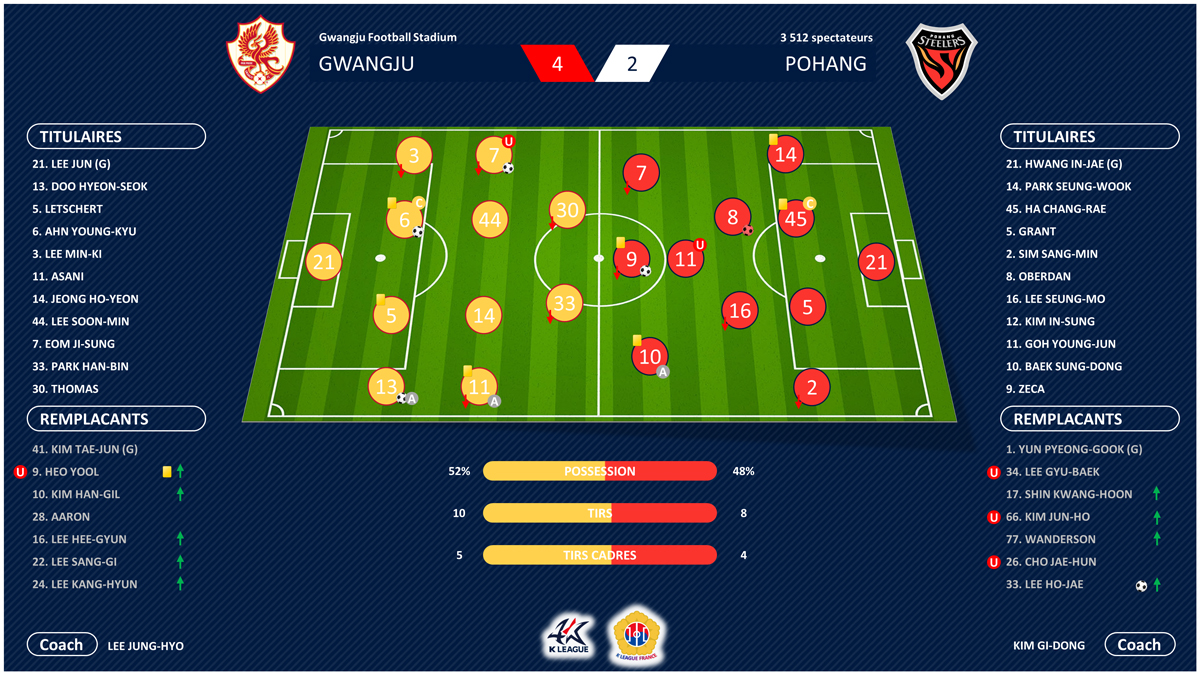 Une rencontre que les Steelers entamaient tambour battant, profitant de la vitesse de Goh Young-jun. Ce dernier trouvait Baek Sung-dong dans la surface qui parvenait à servir pour Zeca. Le Brésilien poussait au fond et permettait aux Steelers de virer en tête (11e, 0-1). Ce premier but précoce laissait présager une promenade de santé pour Pohang mais Gwangju ne se laissait pas facilement faire et les Steelers manquaient de se faire reprendre sur une tentative de Asani qui filait à gauche du but. Malheureusement pour les visiteurs, c'est Oberdan qui envoyait le ballon dans son propre but après avoir été heurté par la déviation de Baek Sung-dong sur le corner de Asani (26e, 1-1). Derrière, Pohang perdait le fil du match permettant à Gwangju de complètement se relancer. Eom Ji-sung trouvait ainsi la barre juste avant la pause. En seconde période, Gwangju continuait d'appuyer et Doo Hyeon-seok envoyait une superbe frappe au fond des filets (56e, 2-1). Un but qui réveillait quelque peu les Steelers, mais Grant trouvait Lee Jun sur le chemin de sa tentative. Mais cette réaction n'était pas suffisante et Gwangju accentuait l'écart par Eom Ji-sung trouvé dans la surface par Asani (65e, 3-1). Loin d'être dans leur assiette, les Steelers partaient à l'attaque et réduisait l'écart grâce à Lee Ho-jae qui sautait plus haut que tout le monde sur un coup franc (75e, 3-2). C'était insuffisant, Gwangju avait la main sur la rencontre et se montrait encore le plus dangereux dans les dix dernières minutes. Lee Hee-gyun alertait ainsi Hwang In-jae qui ne pouvait rien faire sur la tête de Ahn Young-kyu dans la foulée (82e, 4-2). Une belle victoire pour Gwangju qui confirme son résultat de la semaine dernière tandis que les Steelers n'arrivent pas à enchaîner et manque l'occasion de mettre la main sur la seconde place.