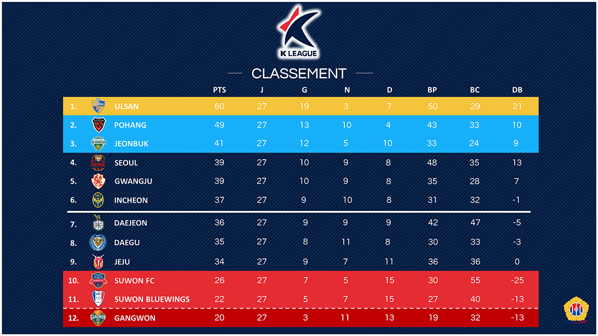 Classiquement, le FC Seoul confisquait le ballon à Daegu et se montrait, pour une fois, le plus dangereux, trouvant rapidement la faille. Sur un ballon dégagé dans l’axe par Hong Chul, Han Seung-gyu décochait une reprise sèche repoussée par le poteau dans les pieds de Oh Seung-hoon. Malheureux sur le coup, le portier de Daegu repoussait le ballon dans son but (1-0, 9e). Cinq minutes plus tard, sur un contre mené très rapidement par Na Sang-ho, ce dernier manquait sa frappe et l’occasion de doubler la mise pour le FC Seoul (15e). Puis, le FC Seoul faisait du FC Seoul. Sur un ballon en cloche dans la surface, Baek Jong-beom semblait être gêné par Lee Keun-ho qui déviait le ballon de l’arrière de la tête au fond des filets. La faute sifflée dans un premier temps était déjugée au VAR et permettait à Daegu d’égaliser (25e, 1-1). Un coup dur pour les locaux qui manquaient d’encaisser un second but dix minutes plus tard mais Hong Jeong-woon manque de précision sur sa tête alors qu’il était absolument tout seul dans la surface (35e). À cinq minutes du terme, Han Seung-gyu, Paločević et Kim Sin-jin se disputaient un coup franc, manquant d’en venir aux mains. C’est finalement le jeune avant-centre qui héritait du ballon et envoyait un coup franc sans grande difficulté en direction de Oh Seung-hoon. Mais ce dernier se loupait totalement et détournait le ballon dans son but (2-1, 42e). En seconde période, les deux équipes s’échangaient les opportunités sans se montrer trop dangereuse jusqu’à ce que Cesinha trouve la tête de Edgar pour l’égalisation (2-2, 82e). Alors qu’il semblait en position de hors-jeu, l’avant-centre brésilien des Sky blues voyait le VAR confirmer son but et permettre à Daegu de décrocher le point du match nul. Un résultat qui ne satisfait pas le FC Seoul et ses supporters mais également son entraîneur. Ahn Ik-soo a ainsi annoncé sa démission en conférence de presse et laisse le club à la quatrième place et englué dans une série de cinq matchs sans victoire. Pour Daegu, ce résultat ne permet de mettre les pieds dans le top 6 avec un sixième match sans succès.