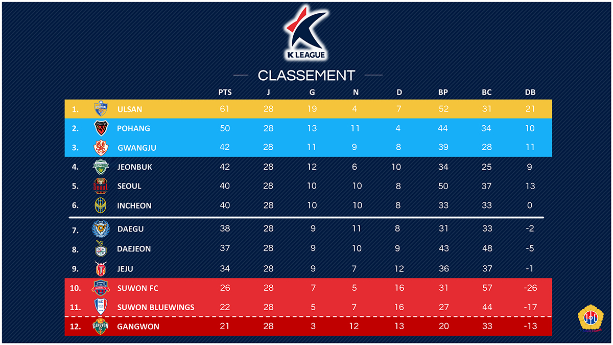 Une belle victoire pour Gwangju qui est assez logique et permet au promu de s’installer sur le podium. En revanche, les Bluewings ne parviennent pas à enchaîner et voient Gangwon revenir à un petit point au classement tout en ne profitant pas de la défaite du premier non relégable, Jeju, pour réduire l’écart. Avec douze points de retard, la marche est toujours aussi haute à dix matchs du terme.