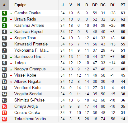 Avec trois clubs encore en course pour remporter le titre de champion 2014, cette dernière journée de J-League ne pouvait que nous offrir du spectacle et des rebondissements. Premier avec 62 points et une différence de buts favorable, Gamba Osaka pouvait assurer son titre de champion en l'emportant à Tokushima. Ce déplacement n'était en apparence pas des plus périlleux pour le leader, puisque le Vortis pointe à la dernière place du classement avec 13 points, dont seulement 3 à domicile (3 matchs nuls). Pourtant, dans ce match ce sont bien les locaux qui se sont montrés les premiers à l'attaque, dominant la première mi-temps malgré leur peu d'occasions de but. Au retour des vestiaires, le Vortis a même cru être récompensé de sa bonne période, mais l'ouverture du score a été refusée pour une position de hors-jeu. Dès lors, avec la rentrée côté Gamba d'Usami entre autres, la domination a rapidement changé de camp. Avec ce dernier à la dernière passe ou à la finition, Gamba s'est créé beaucoup plus de situations dangereuses, mais a complètement failli dans la précision. Gamba a d'ailleurs préféré terminé le match par de la passe à dix dans le rond central, préférant assurer le point du match nul. Score final 0-0.