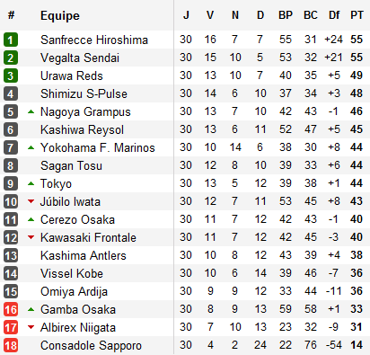 Mais la situation la plus préoccupante reste celle de Gamba. L’un des cinq derniers clubs à n’avoir pas connu la relégation depuis la création de la J-league n’a jamais été si près de la connaître. Opposé au leader Hiroshima, les Ashis sont contraints de concéder le nul et voient Omiya s’échapper. Les écureuils réalisent le coup de la semaine en atomisant le champion sortant Kashiwa chez lui avec un hattrick de Zlatan Ljubijankič. Gamba se retrouve désormais à trois points du maintien et fait face à un redoutable calendrier qui le verra se rendre à Kashiwa, recevoir l’équipe en forme du moment Shimizu puis Tokyo avant de se déplacer à Iwata. Plus que jamais, le grand club d’Osaka devra coller à son nom et ne rien lâcher.