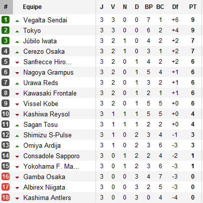Car le Cerezo reste également invaincu après trois journées. Première équipe à marquer face à Kawasaki, le Cerezo fait chuter les Frontale pour la première fois de la saison et se place en embuscade, accompagnant le Júbilo Iwata, bourreau d’un Gamba en pleine débâcle avec une troisième défaite en trois journée. L’un des outsiders pour le titre accompagne en queue de classement les Kashima Antlers, autre géant à la dérive, et les Marinos, battus par le promu Sagan Tosu qui remporte ainsi la première victoire de son histoire en J-league.