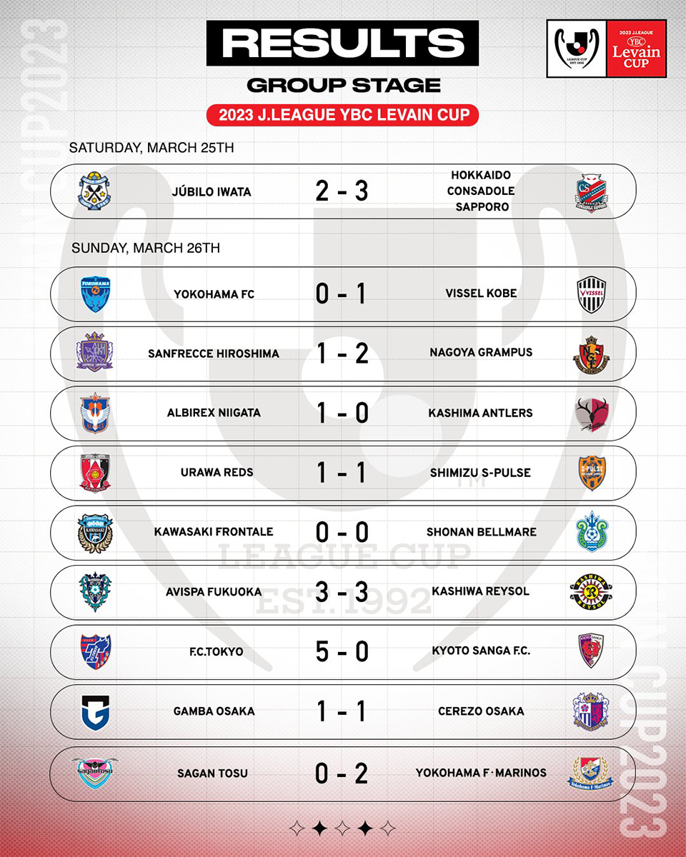 Deuxième journée de la Coupe Levain. La Coupe de la Ligue nippone se disputait le weekend dernier en parallèle des péripéties de la sélection. Deux équipes ont fait carton plein après deux journées : Yokohama F-Marinos, vainqueur sur la pelouse de Sagan Tosu (0-2) et Nagoya Grampus, tombeur de Sanfrecce Hiroshima (1-2). On signalera le carton de FC Tokyo face à Kyoto Sanga (5-0) et le match débridé entre Avispa Fukuoka et Kashiwa Reysol (3-3).