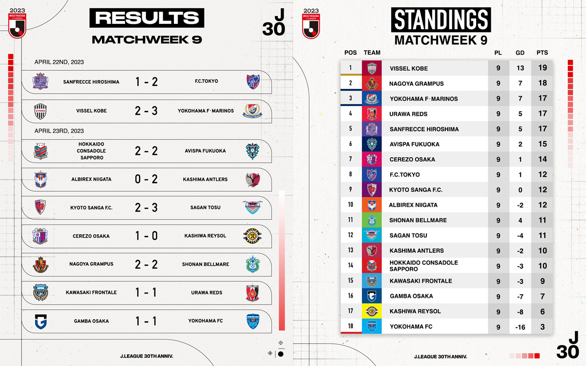 Le lendemain, Nagoya Grampus pouvait rêver à son tour de figurer sur la première marche du podium. Mais il fallait vaincre Shonan Bellmare, qui souhaitait se maintenir en première partie de classement. Dans un match ouvert durant lequel les locaux ont laissé le ballon aux visiteurs, c’étaient bien les premiers qui ouvraient la marque par l’opportuniste Ryoya Morishita. Au retour des vestiaires, les orques mordaient à nouveau par Shinnosuke Nakatani, aux anges d’avoir donné plus de distance à son équipe. Toutefois, il n’était pas tout à fait redescendu sur terre cinq minutes plus tard lorsque, sur un jeu de puissance du trident, Naoki Yamada lançait une frappe dans la surface dans l’angle couvert par Nakatani, qu’il ne pouvait que ralentir dans ses propres filets. Pire, à un quart d’heure du terme, Matheus Castro avait la modestie de célébrer le troisième but de son équipe sur une frappe détourné mollement dans les filets de Song Bum-keun. Joie de courte durée, car le VAR signalait une faute de Nakatani dans sa surface au départ de l’action. Résultat : égalisation de Shuto Makino pour sa sixième réalisation de la saison. On en restera là (2-2).