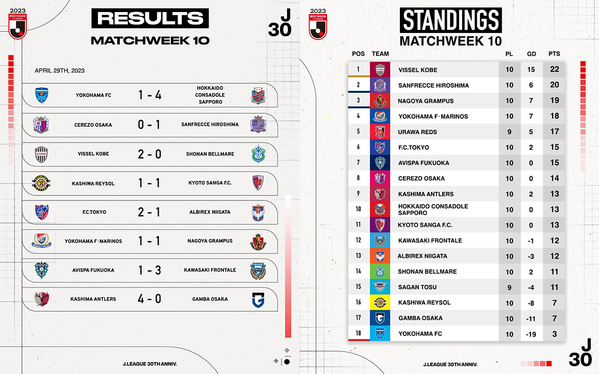 À eux deux, ils ont remporté un tiers des titres de la J1 depuis que le premier championnat s’est tenu en 1993. Dans le dur en ce début de saison, Kawasaki Frontale et Kashima Antlers, candidats supposés au titre de champion, se sont imposés ce week-end. Pendant ce temps, la bataille pour les premières places se poursuit, avec des prétendants qui se neutralisent et Vissel Kobe toujours au-dessus de la mêlée.