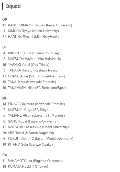 La liste des U20 japonais pour la Coupe du Monde. La Coupe du monde des U20 devait se dérouler en Indonésie entre le 20 mai et le 11 juin, mais pour des raisons politiques doit finalement avoir lieu en Argentine. On suivra les performances de Taichi Fukui, Kuryu Matsuki et Naoki Kumata avec attention. Le groupe qui affrontera le Sénégal, la Colombie et l’Israël dès le 21 mai.