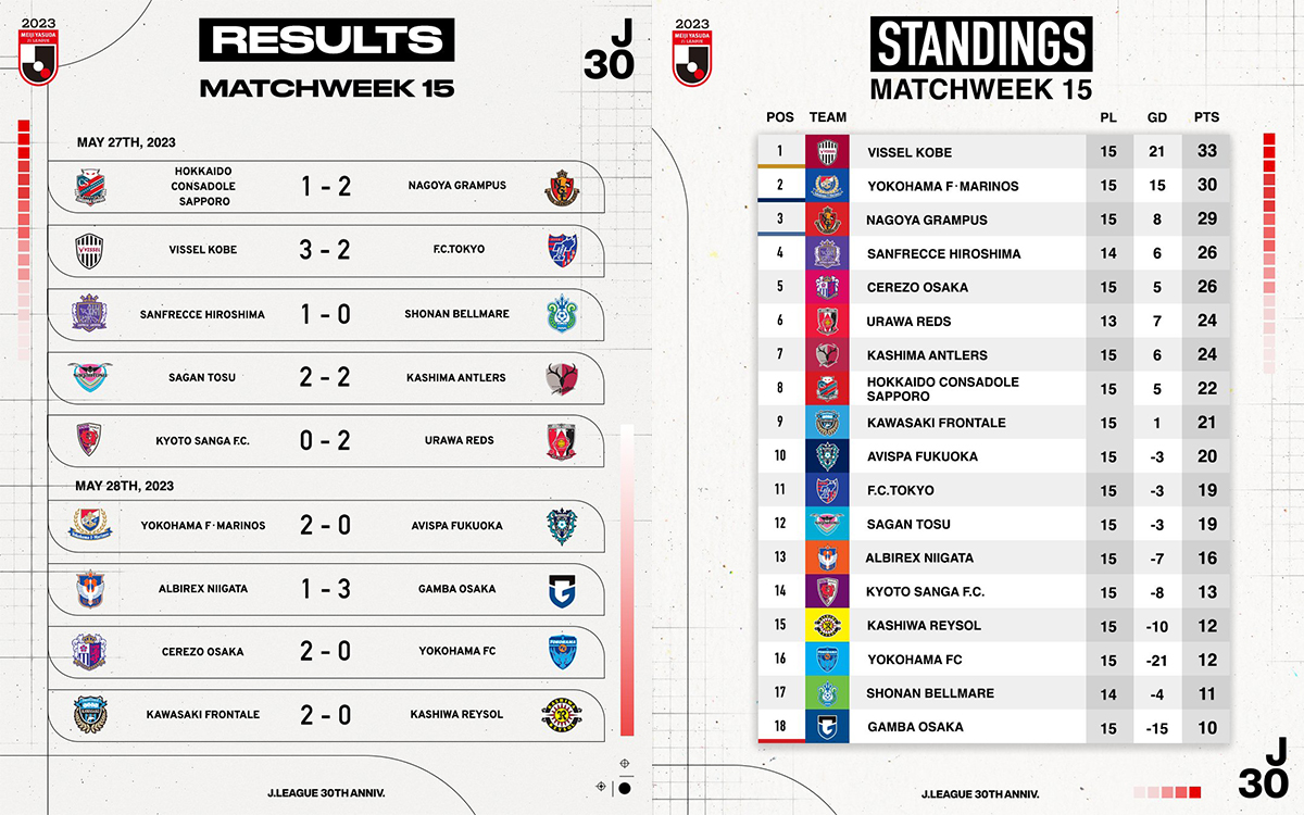Coupe Levain – 5e journée. On arrive quasiment à la fin de la phase de groupe de la Coupe de la Ligue nippone à l’issue de cette journée. Invaincus jusqu’alors mais déjà qualifiés, Yokohama F.Marinos et Nagoya Grampus ont connu leur premier revers face à Consadole Sapporo et Vissel Kobe respectivement. Le club d’Hokkaido devrait également se qualifier tout comme Avispa Fukuoka, vainqueur d’Albirex Niigata. Tout reste à faire dans les groupes B et E.