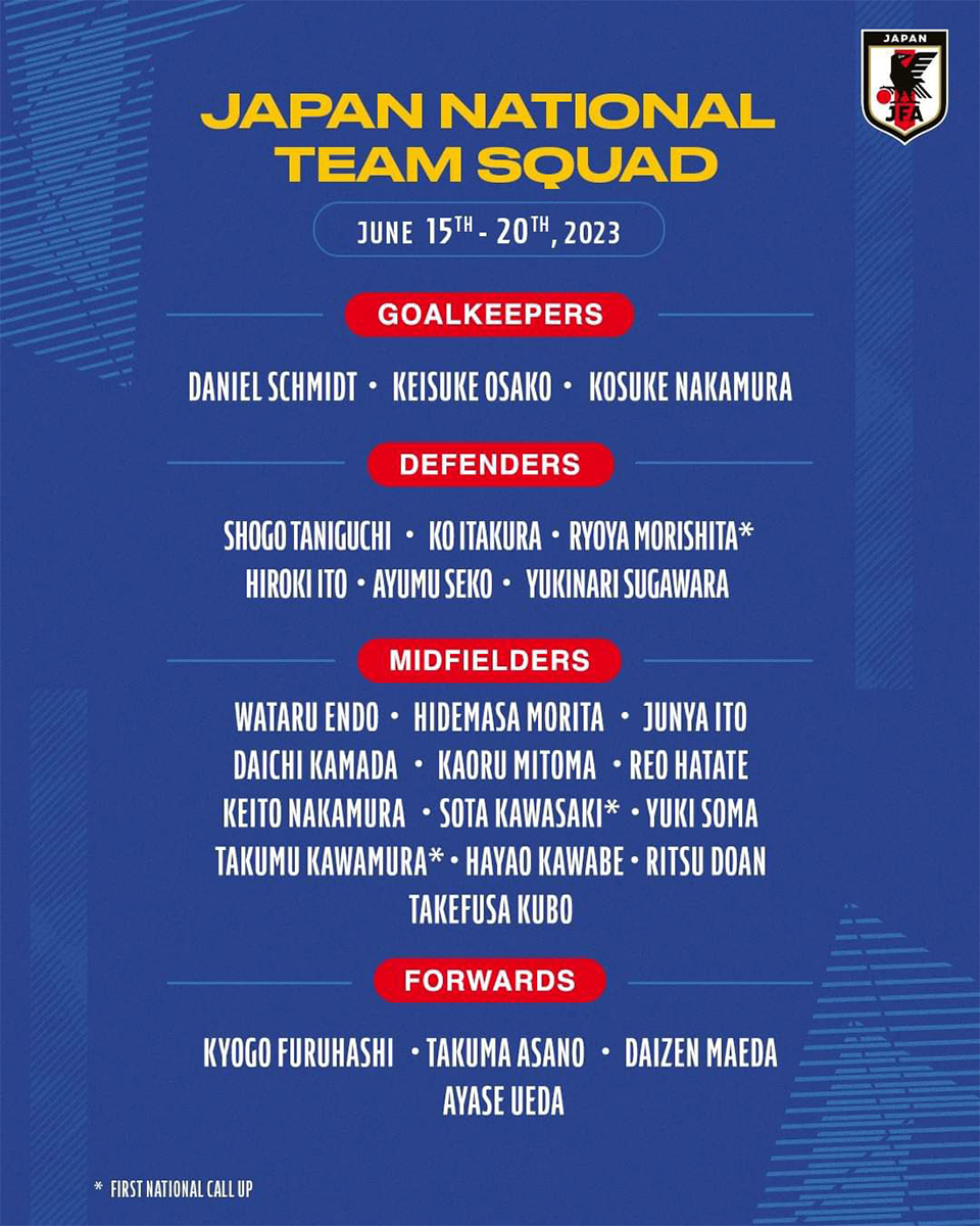Les Samurai Blue sélectionnés pour les amicaux de juillet. Les 15 et 20 juillet viendront s’opposer au Japon les sélections du Salvador et du Pérou. À cette occasion, Moriyasu kantoku nous a réservé quelques surprises avec des retours très attendus (Kyogo Furuhashi, Reo Hatate, Hayao Kawabe, Kosuke Nakamura) et de nouveaux sélectionnés : Ryoya Morishita (Nagoya Grampus), Sota Kawasaki (Kyoto Sanga) et Takumu Kawamura (Sanfrecce Hiroshima). À noter l’organisation d’un match amical entre le Japon et l’Allemagne à la Volkswagen Arena de Wolfsburg le 10 septembre 2023.