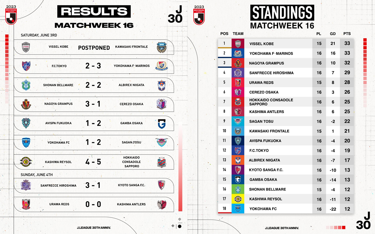 Le match inaugural de cette seizième journée entre Vissel Kobe et Kawasaki Frontale ayant été remis, une aubaine se présentait pour Yokohama F.Marinos, dauphins des vaches avant le coup d’envoi, et Nagoya Grampus, sur la troisième marche du podium, pour revenir sur les hommes de Takayuki Yoshida.