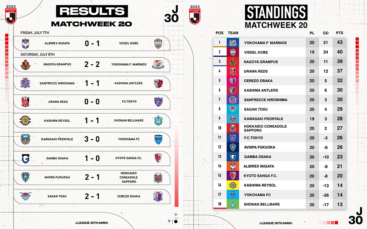 La vingtième journée de J1 a été marquée par le gros duel livré par Nagoya Grampus et Yokohama F.Marinos, deux prétendants au titre, qui n’a pas trouvé vainqueur, maintenant le suspense pour la course au trône. Un autre duel important, dans le bas du classement cette fois, s’est joué entre Kashiwa Reysol et Shonan Bellmare, avec la même issue. Ailleurs au classement, Gamba Osaka continue sa moisson de points tandis qu’Urawa Reds parvient tant bien que mal à rester au contact du podium.