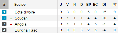 Fin des groupes B, C et D au menu de la semaine. Si la Côte d’Ivoire était déjà assurée de se qualifier, le dernier suspense du groupe B concernait la seconde place qualificative avec le duel à distance entre Soudan et Angola. Un point suffisait aux Palancas Negras. Mais ce point, les hommes de Lito Vidigal ne l’auront pas pris. Battus sèchement par les Elephants ivoiriens, les angolais sont éliminés après la victoire du Soudan sur un bien triste Burkina Faso. C’est LA surprise du groupe, l’Angola, quart de finaliste 2010 passe à la trappe dès le premier tour.