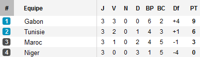 Aucun suspense en revanche dans le groupe C où Gabon et Tunisie n’allait lutter que pour la première place. Dans un match serré, le pays organisateur s’offre un troisième succès en trois rencontre grâce à son buteur providentiel : Pierre Emerick Aubameyang (3 buts en 3 matchs). Les hommes de Gernot Rohr s’offrent donc la première place d’un des groupes les plus relevé de l’épreuve. Notons également le succès pour l’honneur du Maroc sur le Niger.