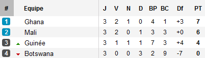 Restait enfin le groupe D avec le duel à distance entre Guinée et Mali. Opposé au favori et déjà qualifié Ghana, le Sily National n’a pu faire mieux qu’un résultat nul, concédant notamment l’un des plus beau but de l’épreuve inscrit par le joueur d’Udine, Emmanuel Badu. Dans le même temps, les maliens d’Alain Giresse éprouvaient les pires difficultés pour se sortir du piège Botswana mais s’imposaient finalement, prenant la dernière place en quart de finale.