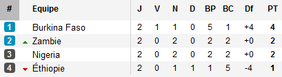 Emmené par un énorme Alain Traoré, le Burkina Faso a totalement écrasé l’Ethiopie. Grace à ce succès convaincant, les Etalons sont en position de se qualifier. Car dans le même temps, Nigeria et Zambie sont repartis dos à dos grâce à un penalty égalisateur du gardien zambien Kennedy Mweene à cinq minutes de la fin. Conséquence, un nul ou une victoire suffira aux burkinabés alors que Zambie et Nigéria se doivent de gagner pour se qualifier.