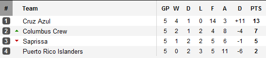 Alors que Cruz Azul est qualifiés, le dernier billet du groupe se jouera à distance entre les costaricains de Saprissa et le champion en titre américain Columbus. Sur le papier, ballotage favorable à Columbus qui se déplacera sur la pelouse des Puerto Rico Islanders alors que Saprissa recevra Cruz Azul. Victoire impérative pour les américains et pour les costaricains.