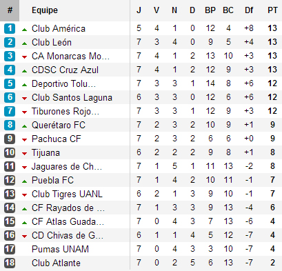 On se doutait qu’elle serait compliquée, elle l’est. Le début de saison des Rayados se solde par le licenciement de Vucetich (malgré le premier succès de la saison face à Tijuana) alors que Chivas se sépare aussi déjà de son coach Benjamin Galindo. Pendant ce temps, le haut du classement est animé par le quatuor América, León, encore invaincus, Morelia et Cruz Azul. Mais Toluca, Veracruz (du meilleur buteur Angel Reyna) et Santos Laguna restent juste derrière.