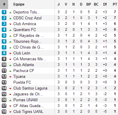 Trois journées déjà disputées et les grands favoris sont déjà placés. Toluca et Cruz Azul mènent la danse, suivis de près par América. Derrière, Querétaro, tombé à Monterrey, perd la première place, se faisant reprendre par les Águilas qui ont profité de la revanche de la dernière finale pour prendre le dessus sur León.