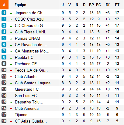 Conséquence, le classement reste plus resserré que jamais, six points séparant les Jaguares, leaders, de Toluca, quinzième.