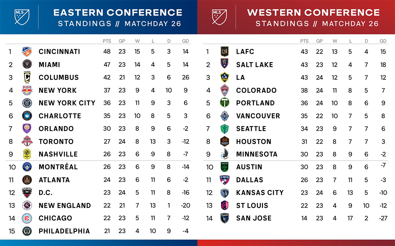 Dans les autres rencontres, Charlotte s’impose à Cincinnati, faisant tomber le leader de l’Est pour la deuxième fois en cinq matchs. DC United rebondit enfin en s’imposant face à Nashville, Montréal prenait le dessus sur Atlanta et se replace dans la course aux play-offs, Orlando gagne sur la pelouse de New England et signe un troisième succès de rang. Toronto se relance en prenant les trois points face à Philadelphie, alors que les deux clubs de New York sont à la peine : les Red bulls se contentant du nul à Houston, City devant partager les points à Chicago. À l’Ouest, Seattle poursuit son incroyable série de victoires en s’imposant à Austin, le LA Galaxy rate le coche et tombe à Dallas, qui se rapproche du top 9, Vancouver donne une leçon à St.Louis, et Sporting KC poursuit sa remontée en s’imposant face à la pire équipe de MLS, San José.